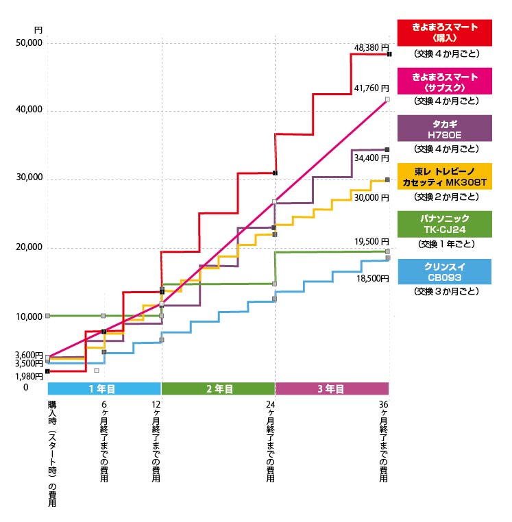 - 3年後:きよまろスマート 48,380円 vs クリンスイ 18,500円(約2.6倍の差!)